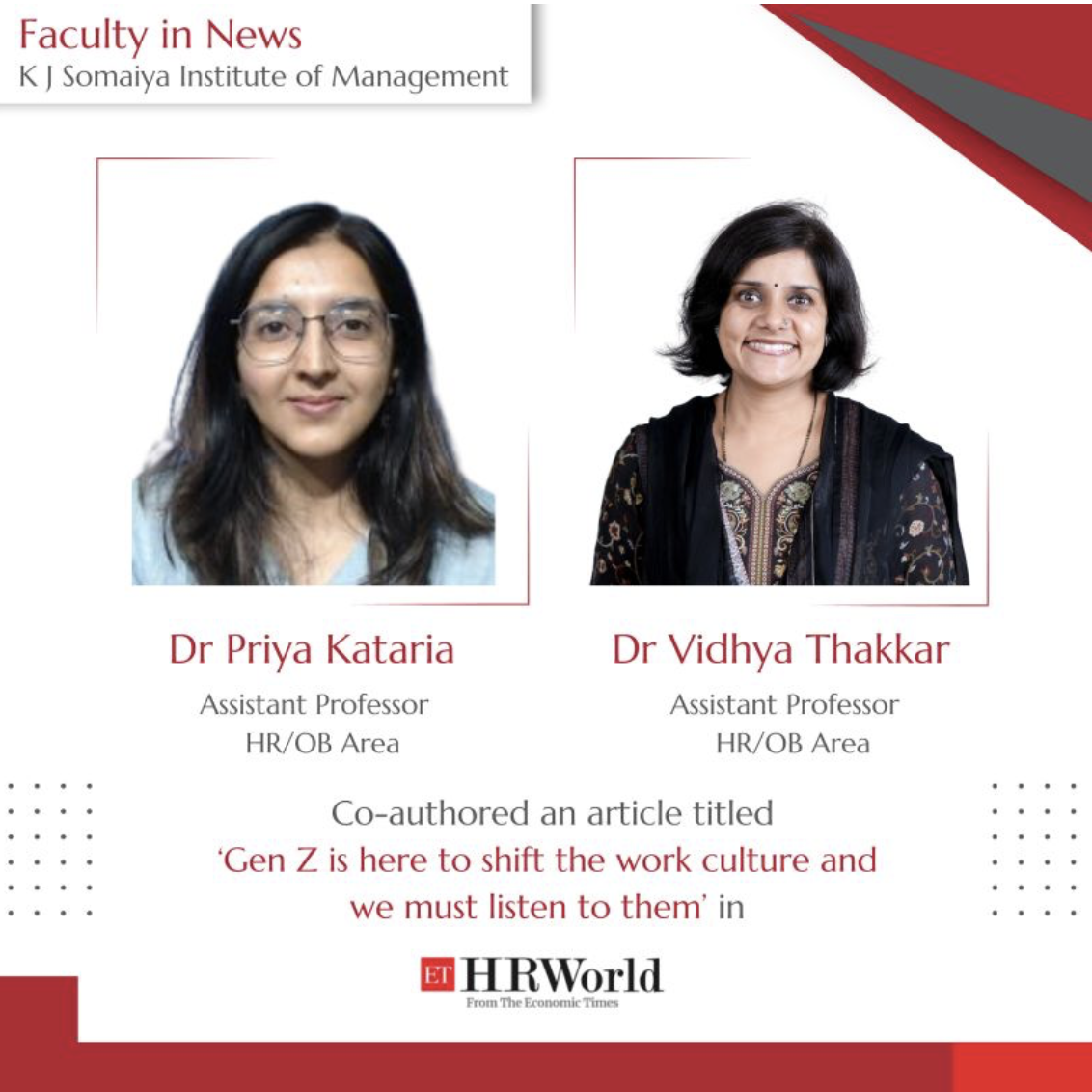 Dr. Vidhya Thakkar (Ph.D), Assistant Professor - Human Resources Management and Dr. Priya Kataria, Assistant Professor - Human Resources Management, K J Somaiya Institute of Management, have co-authored an article titled 'Gen Z is here to shift the work culture and we must listen to them', in HRWorld, The Economic Times.