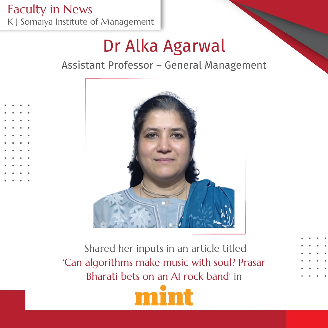 Dr. Alka Agarwal, Assistant Professor - General Management (Entrepreneurship, Business Communication, Strategy), K J Somaiya Institute of Management, was featured in The Mint regarding the transition of AI-generated music from a novelty to a mainstream broadcast medium.She explained how platforms such as Suno and Udio enable users to generate full songs from simple prompts, effectively lowering entry barriers and broadening creative participation.