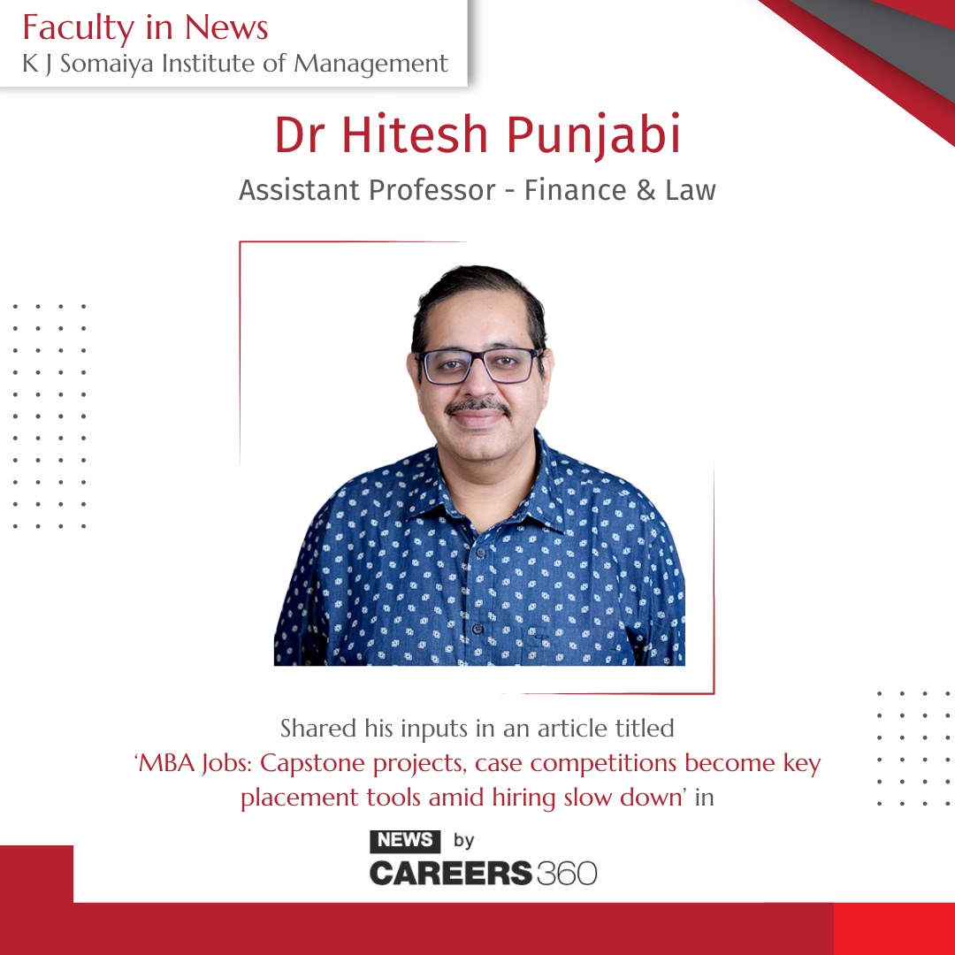 Dr. Hitesh Punjabi, Assistant Professor - Finance and Law, K J Somaiya Institute of Management, was featured in Careers360, where he shared his views on how capstone projects and case competitions are emerging as important pathways for students in the evolving placement landscape.