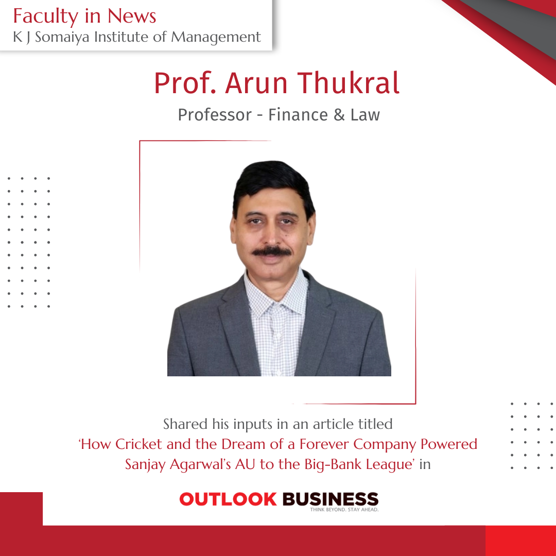 Prof. Arun Thukral, Professor - Finance and Law, K J Somaiya Institute of Management, was featured in Outlook Business in the article titled 'How cricket and the dream of a forever company powered Sanjay Agarwal’s AU to the big bank league'.