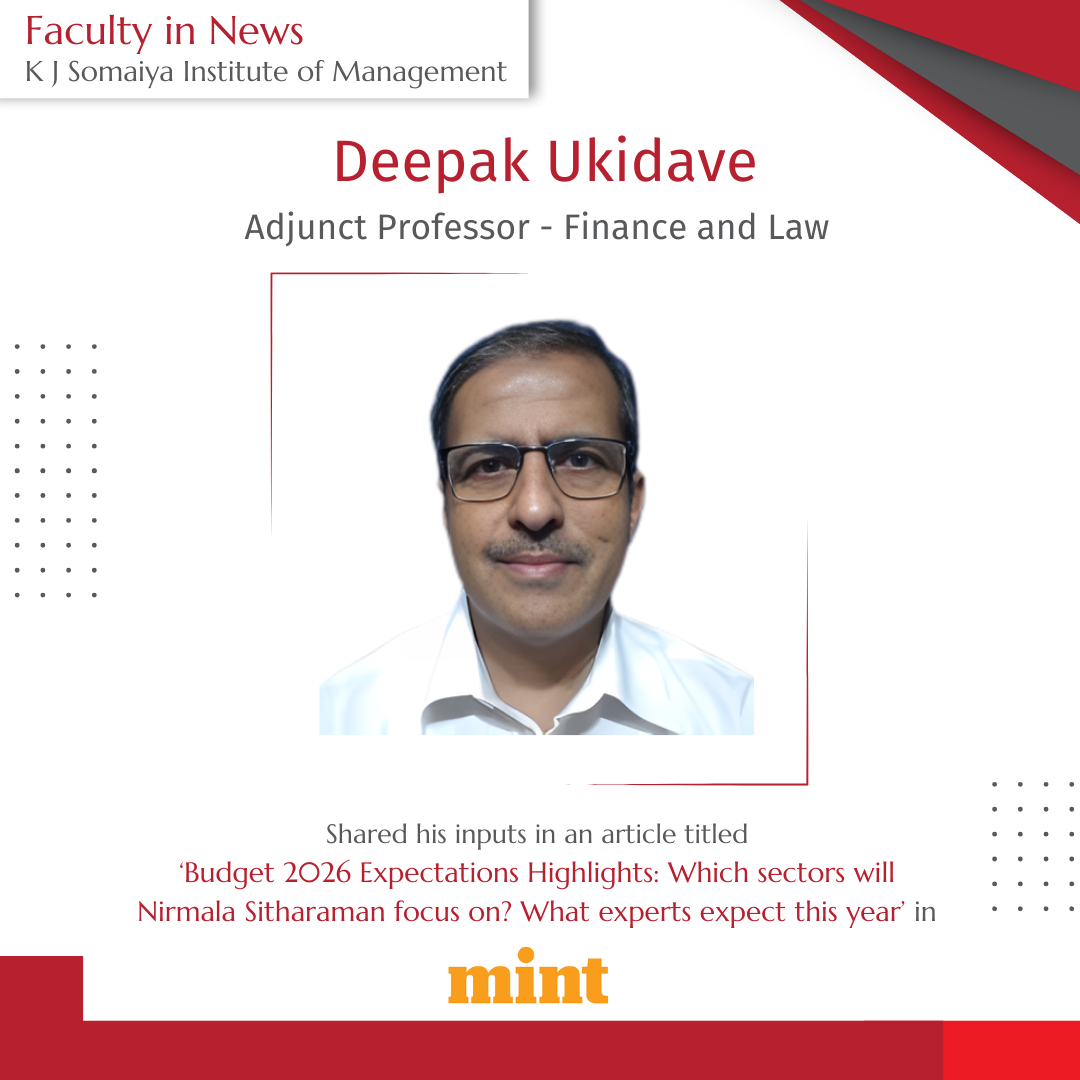 Mint featured insights shared by Prof. Deepak Ukidave, Adjunct Faculty - Finance and Law, K J Somaiya Institute of Management, in an article discussing expectations around the Union Budget 2026 and the sectors likely to be prioritised by Finance Minister Nirmala Sitharaman.