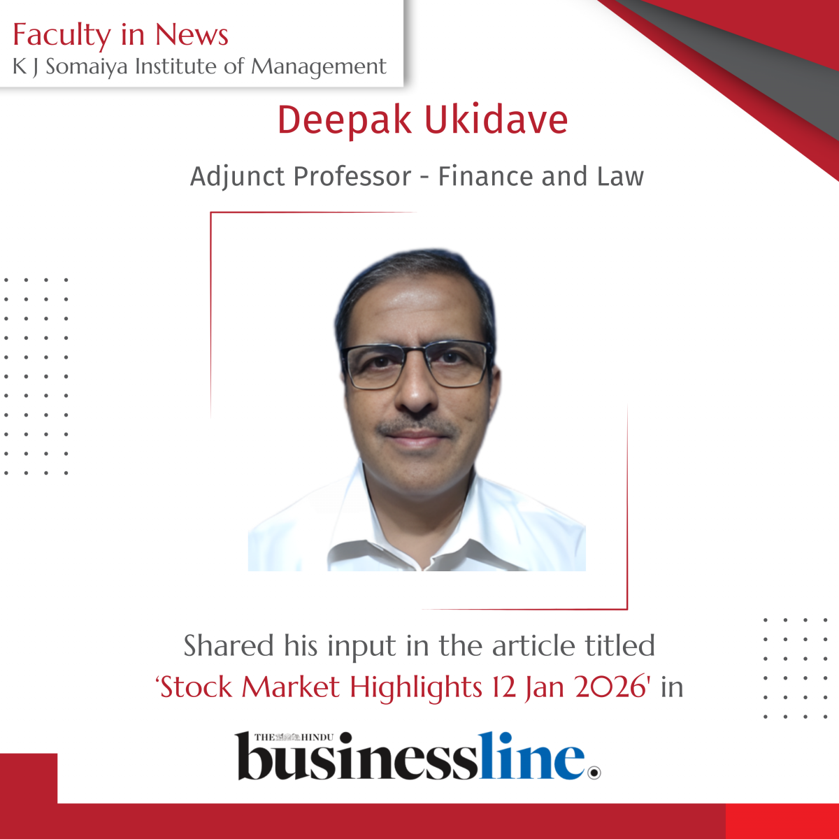 Prof. Deepak Ukidave, Adjunct Professor - Finance and Law, K J Somaiya Institute of Management was featured in The Hindu BusinessLine for sharing his expert insights in the article titled “Stock Market Highlights 12 Jan 2026.”