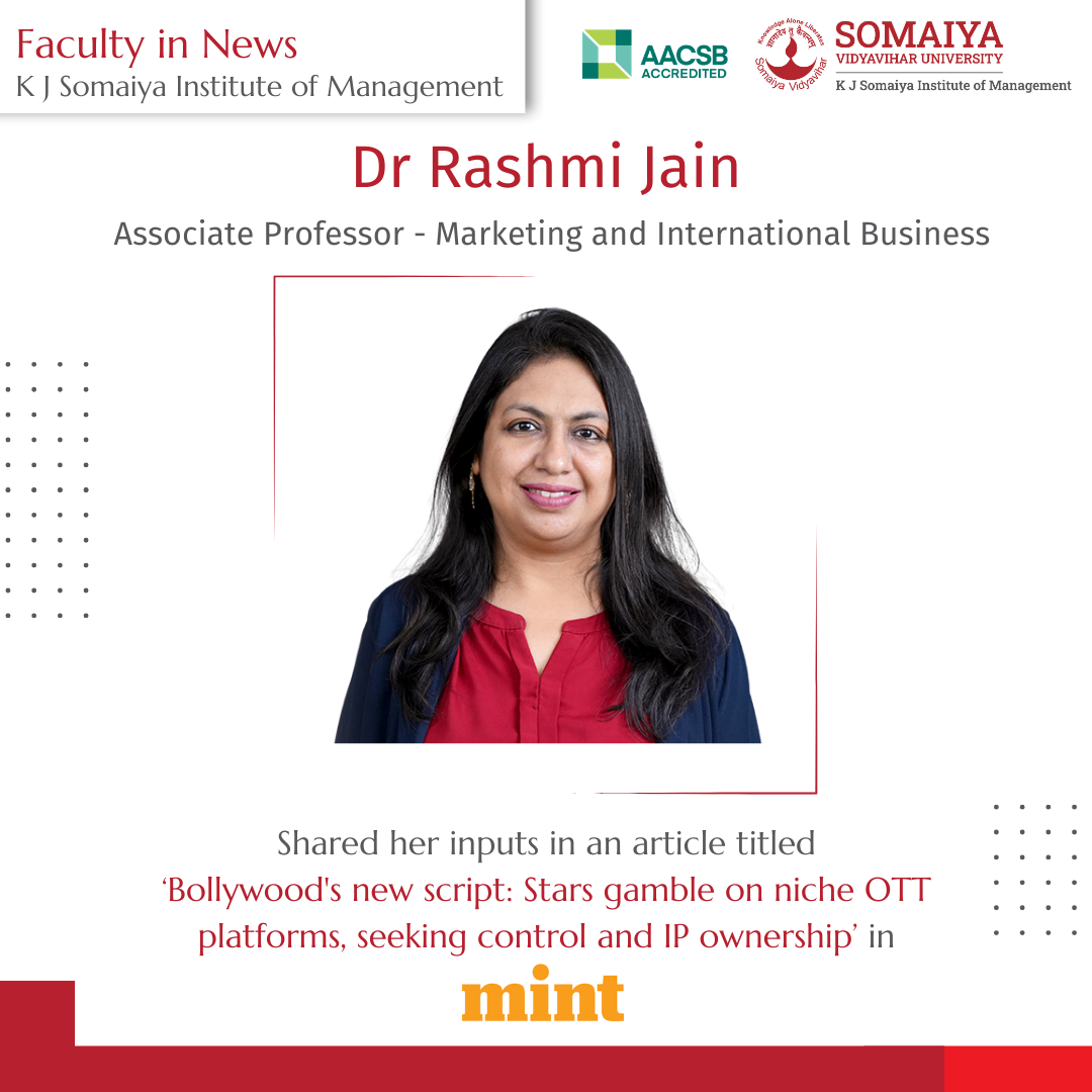 Mint featured Dr Rashmi Jain, Associate Professor - Marketing and International Business, K J Somaiya Institute of Management, for her insights on the evolving OTT ecosystem and the rise of ownership-led digital models.